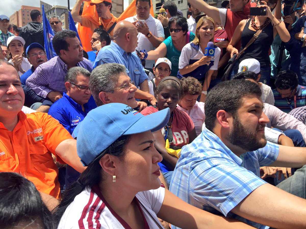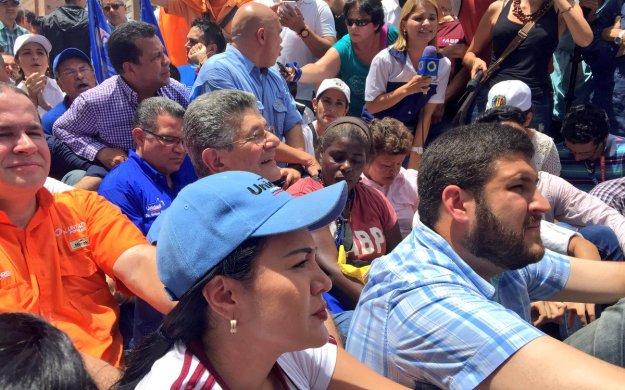 At one point, the opposition figures at the rally organized a sit-in while they waited for rector Rondon’s arrival. Luis Florida (orange, right), Henry Ramos Allup (glasses, centre), Jesus Torrealba (blue shirt, kneeling) and David Smolansky (blue shirt, right) are pictured: