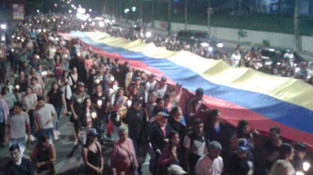 The residents of San Antonio de Los Altos in Miranda state held a vigil tonight for the approximately 41 Venezuelans who have died during the last month of unrest in the country. Demonstrators carried flashlights, candles and a large Venezuelan flag as they marched down a local road in memory of the dead.