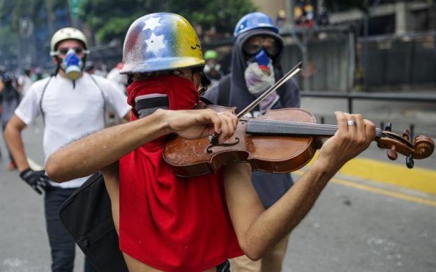 The scene below was captured during the unrest in Chacaito. A protester armed with a violin plays the national anthem as tear gas and rubber bullets choke the air around him: