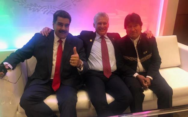 Below, Maduro sitting his Cuban and Bolivian homologues, Miguel Diaz-Carnel and Evo Morales, respectively: