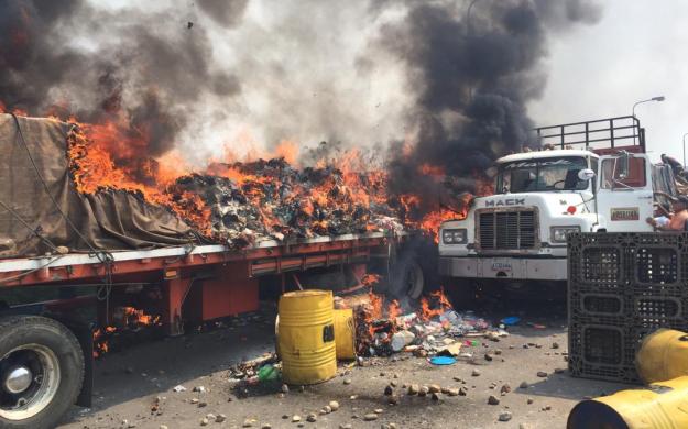 The trucks were abandoned. A journalist at the scene claims that the fires were started by tear gas canister fired near the trucks by the National Bolivarian police: